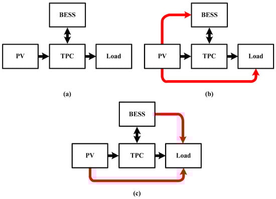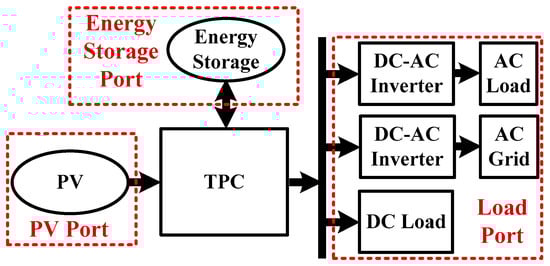 Some circuits with TPC technology instead of two individual DC-DC converters have been proposed to overcome the low efficiency, low power density, and high cost issues of traditional PV systems [59,60]. DC-DC converters equipped with a PV panel and a BESS were integrated into a TPC, resulting in only one power conversion stage between any two ports. Figure 6 illustrates the power flow scheme of traditional TPCs, which include three ports: a PV input port, an energy storage port, and a load port. The PV input port is a unidirectional port that could be a string or array of PV modules. The energy storage port is a bidirectional port that could be connected to supercapacitors and BESSs, which can supply energy to the load and receive power from the PV source. The load port is unidirectional and could be connected to DC loads, such as LEDs and DC motors, or AC loads or an AC grid, through a DC-AC inverter.