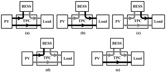 Generally, the power flows among the three ports of a TPC depend on the relationships among the PV power, the BESS power, and the load power [61]. Figure 7 illustrates the operational modes of a TPC (the arrows indicate the power flows), which can be divided into three modes: single-input dual-output (SIDO), dual-input single-output (DISO), and single-input single-output (SISO) modes. When the generated PV power is higher than the load power, the load receives energy from the PV panel through the TPC and the excess PV power supplies the BESS. Thus, the BESS port performs as an output port, and the system enters SIDO mode (Figure 7a). When the PV power is lower than the load power, the TPC is operated in the DISO mode (Figure 7b), as two input DC sources, the BESS and PV, supply energy to the load. For the SISO mode (Figure 7c–e), only one input source and one output port are turned on. This means that one of these three ports (PV port, load port, and BESS port) in the PV system consumes zero power or does not generate any power.