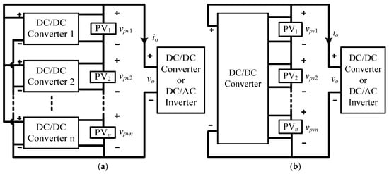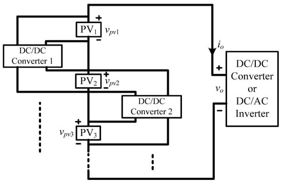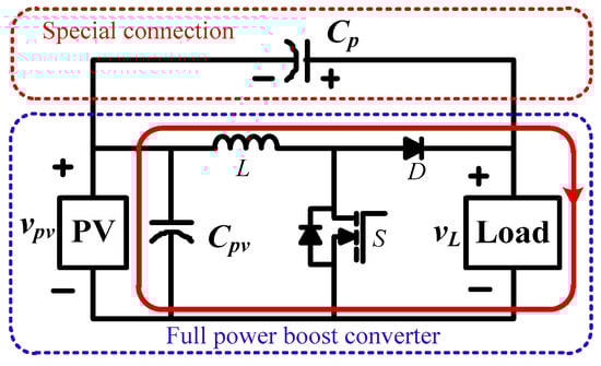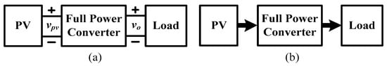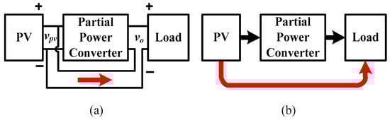 Traditionally, a full power electronic converter (FPC) is connected to the PV module to meet the load requirements and to implement the MPPT algorithm [76]. The circuit configuration and power flow scheme are shown in Figure 8a and Figure 8b, respectively. In a PV system employing an FPC, all PV power is transferred to the load through a DC-DC converter, reducing the power conversion efficiency. To improve the efficiency of the whole PV system, partial power converters (PPCs) are proposed. Only a fraction of the PV power is processed by the DC-DC converter to the load, which can significantly reduce the power losses and the volume [77,78]. Figure 9a and Figure 9b show the circuit configuration and power flow scheme of PPCs, respectively. As can be seen in these figures, an additional direct power flow path from the PV to the load (red lines) is used. Since the losses on the direct power path are negligible, the efficiency is improved, and the voltage and current pressures on the key components, such as inductors, switches, and diodes, are reduced [79].