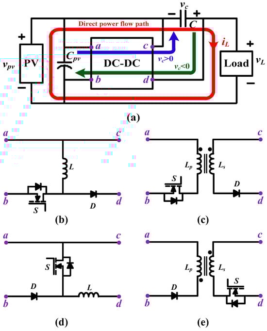 The basic idea of PPCs is that a connection between the PV panel and the load, as shown in Figure 10a (red arrow), is added to a FPC to reduce the power rating. As can be seen in Figure 10a, part of the PV power is transferred to the load through this path (red arrow) with almost 100% efficiency. Another part is processed through a full power converter, with efficiency ηc, to the capacitor C (blue arrow) or returned to the capacitor Cpv connected to the PV panel (green arrow), depending on the circuit operation modes. When vc is positive, the circuit is operated in the step-up mode, whereas the step-down mode is entered if vc is negative. Figure 10b and Figure 10c show two examples of step-up operation with buck–boost and flyback converters, respectively. Figure 10d and Figure 10e illustrate two examples of step-down operation with boost and flyback converters, respectively. Points (a), (b), (c), and (d) in Figure 10b–e relate to the points in Figure 10a.