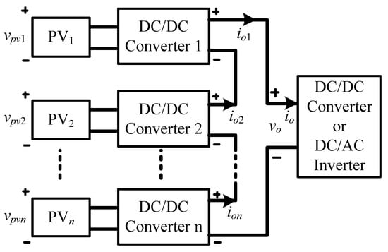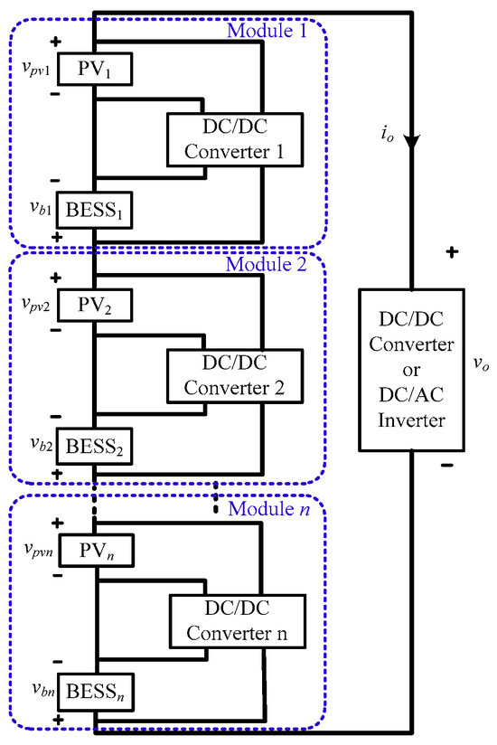 Moreover, PV panels are usually connected in series to cope with high voltage and power requirements [20]. For these internal connections of PV panels, partial shading situations are frequently encountered, causing some issues such as the diminution of the output voltage and power, some hot spots in the panels, and reduction of the system lifetime [21]. To overcome these problems, the distributed PV system with distributed maximum power point tracking (DMPPT) was introduced [22,23]. In this system, each solar panel is connected to an individual DC-DC converter to supply the energy to the load. With such a configuration, every PV panel can be operated at the maximum power point (MPP) by regulating its associated converter, avoiding energy waste. However, since the energy generated by the PV panel highly depends on the weather conditions, the PV power varies with the time. Mismatches between the generated PV power and the required load power may happen. When the power generated by the PV panels is higher than the load power, to maintain the generated and delivered power at the same level, either a PV power curtailment algorithm [24] is needed to reduce the generated PV power to the load power level, or a BESS is required to be connected to the PV systems to absorb the surplus PV power. Compared to the employment of a PV power curtailment algorithm, the PV power in BESS-integrated PV systems is optimally used, avoiding energy waste [25].