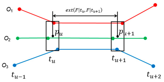 - Step 1: for each flock pattern , assume the corresponding time interval of is , calculate the spatial extent of between and , if , the time interval is divided into two sub time intervals, i.e., and . Repeat this process until the spatial extent of between any two consecutive timestamps is checked. Thus, is divided into multiple sub flock patterns if there exist time intervals during which the objects involved in appear stationary.