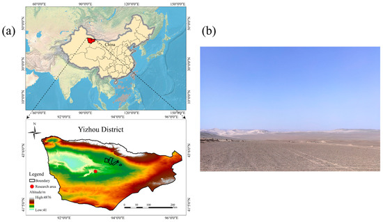 The study area is located in the central part of Yizhou District, Hami City, Xinjiang, China, with relatively flat terrain between the Tianshan Mountains in the north and the Gobi Desert in the south. The geographical coordinates are 93°15′00″ E~93°05′30″ E and 42°25′15″ N~42°16′45″ N (Figure 1a). There are many remnant mounds in the study area, which are rounded and flat at the top. The arid valleys between the residual hills are broadly developed, and the surface is covered with rock debris, sand, and gravel, typical of the Gobi landscape (Figure 1b). With long, cold winters; hot and dry summers; large annual and daily temperature differences; and year-round drought with little rain, it has a temperate continental arid climate [15]. With long light hours and high solar radiation, the total annual solar radiation can reach 6397.35 MJ/m2. The average annual wind speed is 3 m/s~4 m/s, the average annual temperature is 3 °C~17 °C, the average annual precipitation is 50.78 mm, and the average annual evaporation is 3064.13 mm. The soil types in the study area are mainly desert soils with very high salt content, and the soil specifics are shown in Table 1.