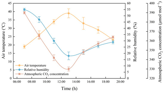 Meteorological factors were monitored using automatic meteorological stations in the vicinity of the study area, and changes in meteorological factors were recorded every hour. The meteorological factors measured include the atmospheric temperature (°C), relative humidity (%), and atmospheric carbon dioxide concentration (μmol·mol−1). The daily variation in meteorological factors in the study area is shown in Figure 2. Atmospheric temperatures showed a significant upward trend from 07:00 to 11:00 and reached a maximum at 13:00 with temperatures up to 39 °C, followed by a slow downward trend. The trends in relative humidity and atmospheric carbon dioxide concentration were consistent. Both the relative humidity and atmospheric carbon dioxide concentration were the highest in the early morning. They showed a gradual decreasing trend from 7:00 to 11:00 and reached a minimum at 13:00 with 18% and 330 μmol·mol−1, respectively. This was followed by a slow upward trend in relative humidity and atmospheric carbon dioxide concentration as the atmospheric temperature decreased.