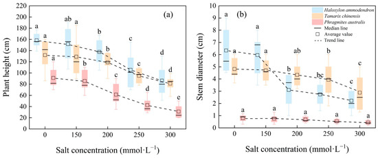 Effects of different salt concentration treatments on the growth of halophytes. (a) Plant height. (b) Stem diameter. Different lowercase letters in the graphs indicate significant differences under different salt concentration treatments (p < 0.05). A total of 375 samples. Same as below.