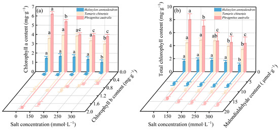 Effect of different salt concentration treatments on the physiology of halophytes. (a) Contents of chlorophyll a and chlorophyll b. (b) Contents of total chlorophyll and malondialdehyde. The error bar above the graph represents the standard error. Different lowercase letters in the graphs indicate significant differences under different salt concentration treatments (p < 0.05).