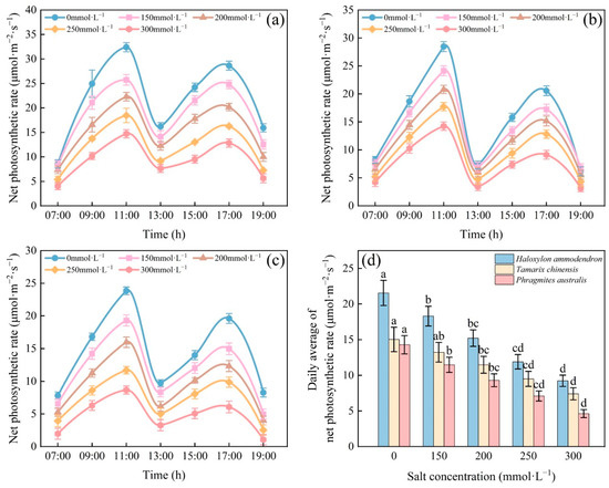 Characteristics of daily changes in Pn of halophytes under different salt concentration treatments. (a) Ha. (b) Tc. (c) Pa. (d) Daily average of net photosynthetic rate. The error bar above the graph represents the standard error. The same below. Different lowercase letters in the graphs indicate significant differences under different salt concentration treatments (p < 0.05).