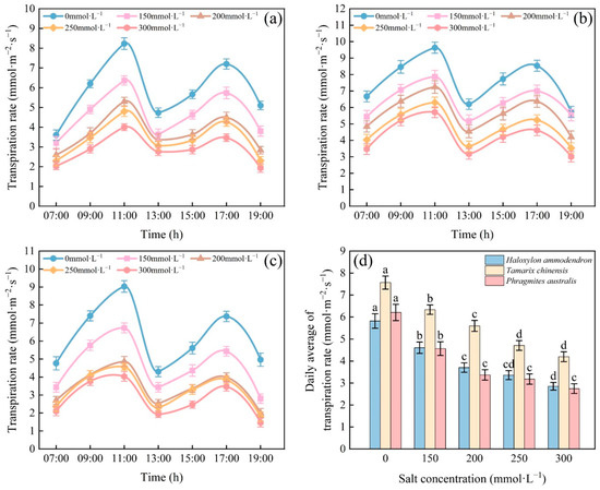 Characteristics of daily changes in Tr of halophytes under different salt concentration treatments. (a) Ha. (b) Tc. (c) Pa. (d) Daily average of transpiration rate. Different lowercase letters in the graphs indicate significant differences under different salt concentration treatments (p < 0.05).