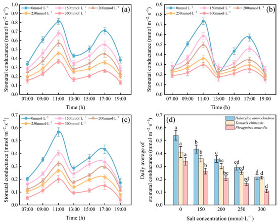 Characteristics of daily changes in Gs of halophytes under different salt concentration treatments. (a) Ha. (b) Tc. (c) Pa. (d) Daily average of stomatal conductance. Different lowercase letters in the graphs indicate significant differences under different salt concentration treatments (p < 0.05).