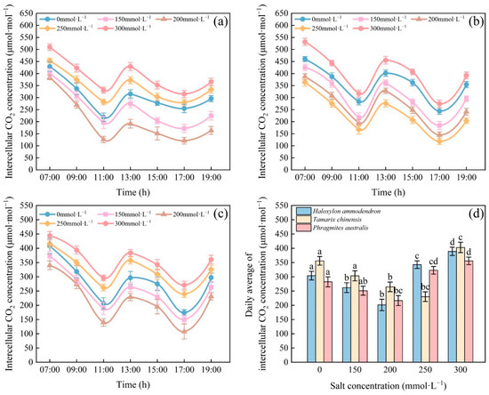Characteristics of daily changes in Ci of halophytes under different salt concentration treatments. (a) Ha. (b) Tc. (c) Pa. (d) Daily average of intercellular carbon dioxide concentration. Different lowercase letters in the graphs indicate significant differences under different salt concentration treatments (p < 0.05).