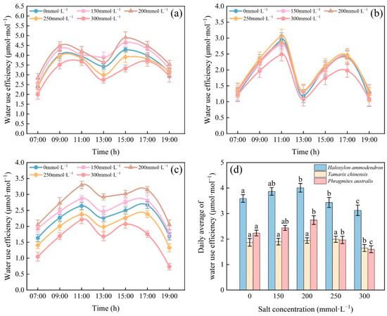 Characteristics of daily changes in Wue of halophytes under different salt concentration treatments. (a) Ha. (b) Tc. (c) Pa. (d) Daily average of water use efficiency. Different lowercase letters in the graphs indicate significant differences under different salt concentration treatments (p < 0.05).
