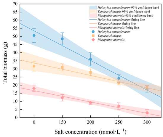 The biomass of all three halophytes was affected to varying degrees with increasing salt concentration. As can be seen in Figure 10, the biomasses of Ha, Tc, and Pa all showed a decreasing trend with increasing salt concentration. The biomasses of Ha, Tc, and Pa were highest in the treatment with a salt concentration of 0 mmol·L−1 and decreased to a minimum at a salt concentration of 300 mmol·L−1. The biomasses of Ha, Tc, and Pa were 50.60, 31.70, and 18.00 g, respectively, at a salt concentration of 0 mmol·L−1 treatment. The biomasses of Ha, Tc, and Pa were reduced by 64.9%, 41.2%, and 83%, respectively, at a salt concentration of 300 mmol·L−1 treatment compared with the control. Biomass was analyzed by regression for salt concentration treatments and three halophytes. The fitted R2 for biomasses of Ha, Tc, and Pa were found to be 0.663, 0.708, and 0.597, respectively, which were all greater than 0.5, providing a good fit (Table 3). Meanwhile, significant correlation (p < 0.05) was found between salt concentration treatments and biomass of all three halophytes through ANOVA testing.