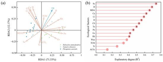 Relationship between different ecological factors and biomass of halophytes. (a) RDA ordination plot of ecological factors versus halophytes biomass; (b) degree of explanation of halophyte biomass by each ecological factor; “ACO2” is atmospheric carbon dioxide concentration. “Tr” is transpiration rate. “TChl” is total chlorophyll. “Wue” is water use efficiency. “Rh” is relative humidity. “Gs” is stomatal conductance. “Pn” is net photosynthetic rate. “Ta” is atmospheric temperature. “Cb” is chlorophyll b. “D” is stem diameter. “Ci” is intercellular carbon dioxide concentration. “Ca” is chlorophyll a. “MDA” is malondialdehyde. “H” is plant height. “Sc” is salt concentration. “TB” is total biomass. * represents p < 0.05.