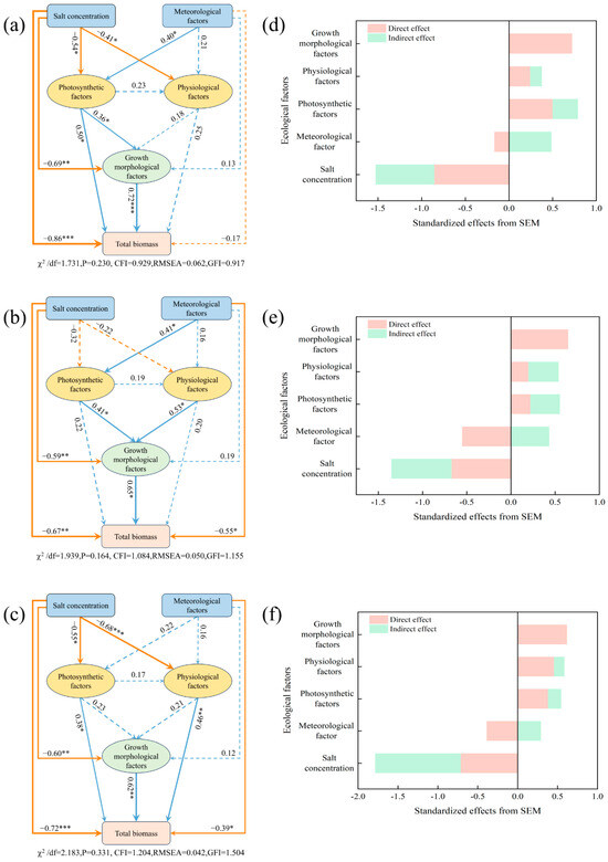 Structural equation modeling of different ecological factors and biomass of halophytes. (a) Structural equation modeling of different ecological factors with Ha biomass; (b) structural equation modeling of different ecological factors with Tc biomass; (c) structural equation modeling of different ecological factors with Pa biomass; (d) direct and indirect effects of different ecological factors on Ha biomass; (e) direct and indirect effects of different ecological factors on Tc biomass; (f) direct and indirect effects of different ecological factors on Pa biomass; blue arrows in the figure represent positive correlations, and orange arrows represent negative correlations. A solid line indicates a significant effect, and a dashed line indicates a non-significant effect. The numbers next to the arrows are standardized path coefficients, which reflect the magnitude of the effect between the variables. The width of the arrows is proportional to the standardized path coefficient. * represents p < 0.05. ** represents p < 0.01. *** represents p < 0.001.