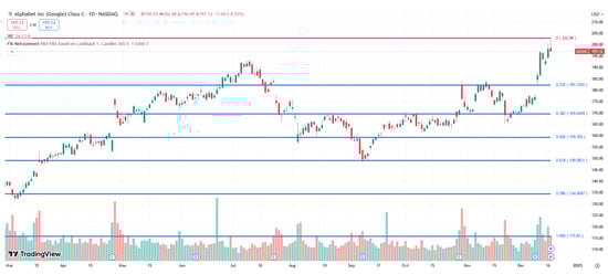 The mathematical foundation of the EWP is integrated with Fibonacci relationships [16]. The Fibonacci sequence, where each number is the sum of the previous two, generates important ratios that appear not only in financial markets but also in nature, art and architecture. The most important of these is the golden ratio (known as , approximately 1.618) and its reciprocal 0.618. These ratios help quantify relationships between different waves, with wave 2 often retracing 50% or 61.8% of wave 1, wave 3 frequently extending to 1.618× the length of wave 1, and wave 4 typically retracing 38.2% of wave 3 [1,4]. Figure 4 present these ratios, applied on the stock market chart, and as we can see, the lines often coincide with local tops and bottoms, predicting where the price of the asset may stop.