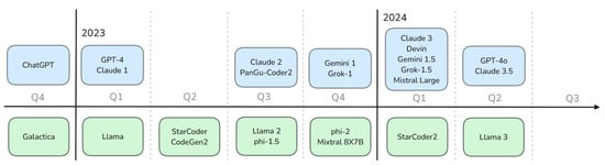 LLMs represent a significant advancement in the field of AI and NLP. These models are designed to understand, generate, and interact with human language in a way that is increasingly indistinguishable from human performance. Examples of LLMs include OpenAI’s GPT-4 and GPT-4o [20], Google’s Gemini [21], and Claude and the LLaMA series [18]; their releases have been shown in Figure 5. They have been trained on vast amounts of text data and leverage advanced transformer architectures to perform a wide range of language-related tasks, from translation and summarization to question answering and creative writing [18].