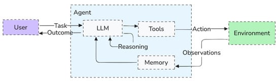 The ReAct (Reasoning and Acting) [40] agent is designed to enable LLMs to engage in dynamic decision-making and problem-solving through iterative cycles of reasoning and action. The ReAct framework, which integrates memory, reasoning, and task execution, allows an agent to navigate complex environments by balancing its cognitive and operational processes. This architecture, depicted in Figure 10, exemplifies a modular system where LLMs interact with tools, memory, and the external environment to achieve task outcomes.
