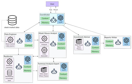 ElliottAgents further leverages a multi-agent structure to address specific analytic tasks efficiently [33,37]. Each agent within the system handles a dedicated aspect of financial analysis—data retrieval, pattern recognition, report generation—coordinated to work toward a cohesive output. This modularity allowed agents to interact and learn iteratively, combining their specialized knowledge to enhance overall predictive accuracy. The system’s adaptability stems from its ability to dynamically adjust agent tasks based on real-time analysis needs, while each agent’s discrete role provides transparency and interpretability, essential for human analysts needing insight into each step of the decision-making process. Potential industrial applications of ElliottAgents include:
