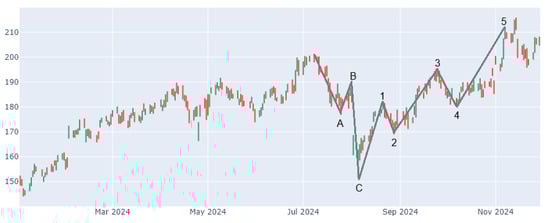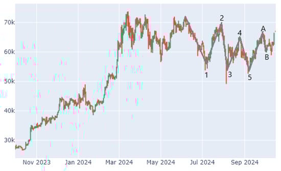 Evolution of financial market analysis has traditionally relied on two primary approaches: fundamental analysis, which examines intrinsic value through financial metrics, and technical analysis, which focuses on price patterns and market behavior. While these approaches remain relevant across both traditional and cryptocurrency markets, their application and effectiveness vary significantly between these domains. Traditional markets benefit from established valuation metrics and regulated information disclosure [3], whereas cryptocurrency markets often rely more heavily on technical analysis due to the relative absence of standardized fundamental metrics. Technical analysts primarily use candlestick charts, as shown in Figure 1, which provide detailed visualization of price movements and market trends. Among technical analysis methods, the Elliott wave principle (EWP) [4] has emerged as a particularly effective approach for identifying market patterns based on collective investor psychology. The EWP identifies recurring wave formations in price movements, illustrated in Figure 2, which reflect cycles of market sentiment and behavior. However, the manual application of such methods faces significant challenges in today’s high-speed, data-intensive trading environment.