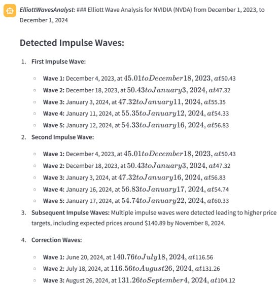 The integration of the EWP within the multi-agent framework demonstrated that traditional technical analysis methods could be enhanced when combined with AI-driven tools. The EWP fractal patterns in market behavior, supported by LLMs and DRL, allowed ElliottAgents to identify significant market trends accurately and to generate actionable insights based on past behaviors. LLMs enabled the system to contextualize and interpret complex patterns within a broader dataset, increasing its ability to process diverse market scenarios. Additionally, DRL contributed a layer of continuous improvement, allowing the system to learn from historical data and refine its analytical models, which proved crucial for the system’s adaptability in rapidly changing market conditions.