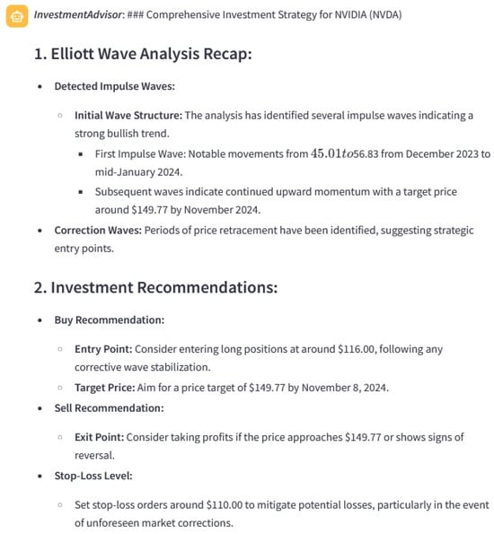 The system’s practical efficacy was demonstrated through validation across multiple market scenarios. In our extended testing period, ElliottAgents achieved notable performance metrics, including a 17.4% return on investment in long-term position trading for NVDA stock and a 13.3% gain in medium-term trading for GOOGL. These results were achieved through identification of wave patterns and strategic entry/exit points. Furthermore, the system demonstrated robust risk management capabilities by accurately identifying support and resistance levels, with stop-loss recommendations maintaining an average drawdown limitation of 5% across tested scenarios. While these results highlight the system’s practical value, direct comparisons to baseline models are challenging due to ElliottAgents’ unique combination of visual and numerical outputs, which enhance interpretability. Future research will focus on developing benchmarking frameworks that can evaluate such multi-faceted systems effectively.