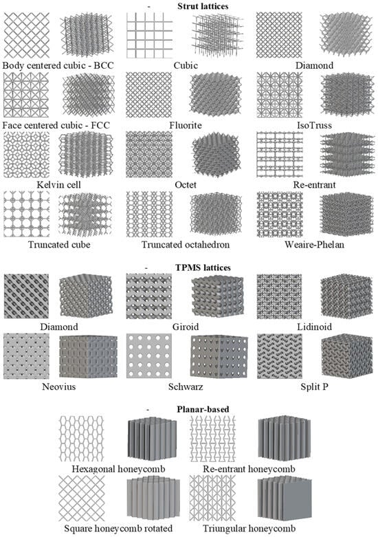 Several software packages have been developed and can be applied for lattice structure design and topology optimization (Altair OptiStruct/Inspire, nTop—former nTopology, AutodeskFusion 360 with Netfabb, Ansys Discovery, Siemens NX/Solid Edge, Dassault Systems Solidworks, Creo, Materialize/3-Matic STL, Synopsys/Simpleware ScanIP [11,12]). Over the years, many categories of periodic lattice structures have been developed: strut lattices, surface-based lattices (which include triply periodic minimal sur-faces—TPMSs), and planar-based lattices. Figure 1 presents many examples of lattice structures with multiple unit cells (images generated in nTop software, version 4.9—nTopology Inc., New York, NY, USA, designed with a 2 mm length cell distributed over a cube with a 10 × 10 × 10 mm3 volume).