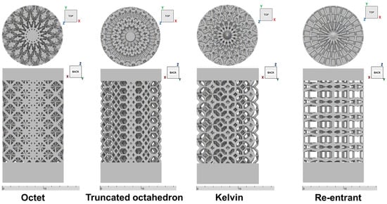 Four different strut cell types were selected for this study: re-entrant, Kelvin, truncated octahedron, and octet. The selection of the cell types was justified by the lack of information regarding the compressive properties of such cells in the case of the two alloys that were used for manufacturing. Using nTop software (version 4.9, nTopology Inc., New York, NY, USA), the lattice section with the corresponding cell type was integrated into the specimen using the conformal patterning method. The unit cell dimensions were constant regardless of the cell type used, and they had a radius of 3.7 mm, a height of 3.7 mm, and a strut thickness of 0.5 mm. The cells were distributed at 15 circular arcs from the center of the specimen, and the tolerance was 0.2 mm. Figure 2 shows views of the designed cylindrical specimens in different sections.