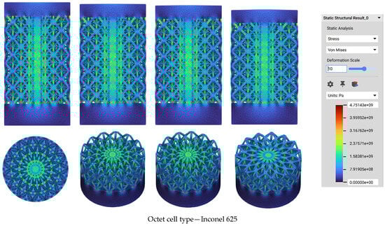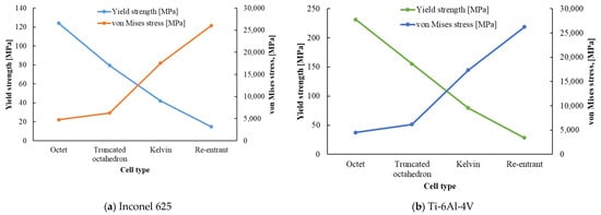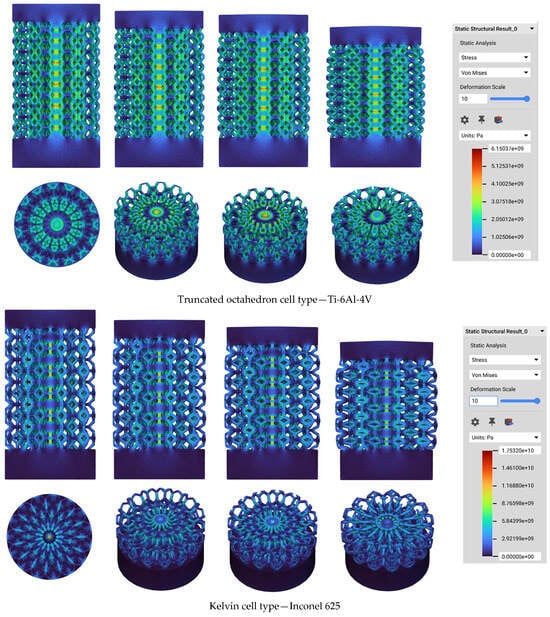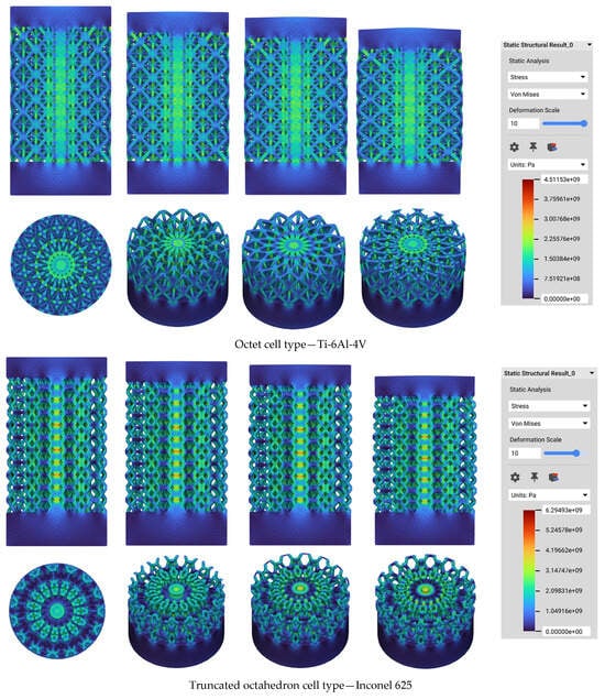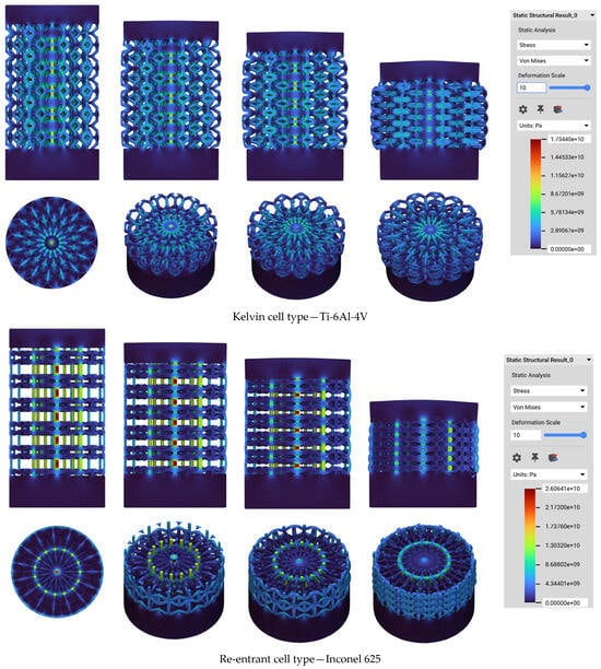Static finite element analysis results—von Mises stress comparison for different cell topologies (octet, truncated octahedron, Kelvin, re-entrant) and materials (Inconel 625, Ti-6Al-4V).