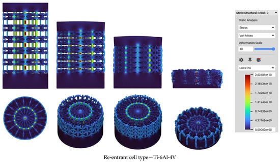 The nTop software does not provide stress–strain curves, and the results obtained for the von Mises stress are significantly higher than those obtained experimentally. Yielding initiates when the von Mises stress reaches the uniaxial yield strength in uniaxial compression tests. Under the specified test conditions, all cell types, regardless of the manufacturing material, experienced yielding. Comparing the results of the simulations with those obtained experimentally regarding yielding, it was determined that the highest von Mises stress was recorded for the re-entrant cell type, as it had the lowest yield strength determined experimentally. The results are graphically presented in the graph in Figure 11.