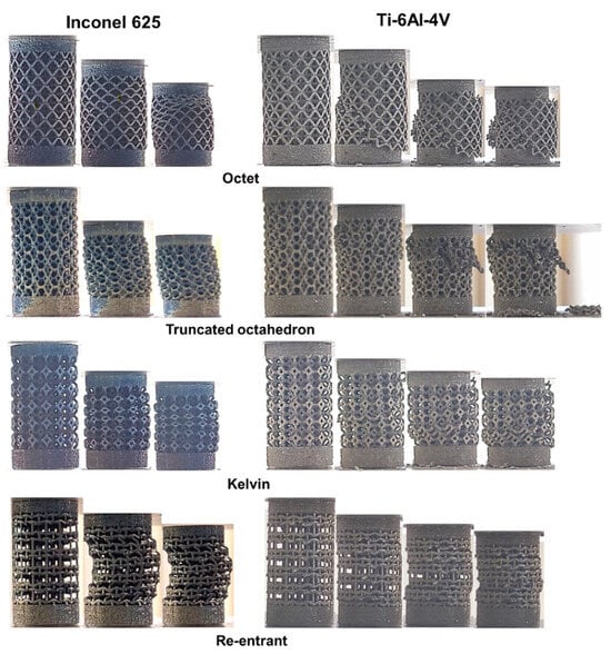 The results of the compressive behavior analysis of the lattices are consistent with those of other authors. In the present case, the simulation results show the same type of material failure regardless of the material selected, but experimentally, Inconel 625 is characterized by a bending-dominant mode regardless of the lattice type tested, while Ti-6Al-4V is characterized more by a stretch-dominant mode, especially in the case of the re-entrant lattice. These modes were also identified in the review performed by Benedetti et al. [40]. No full densification was achieved regardless of the lattice type, as the compression test ended when the 7 mm elongation was achieved, considering it was enough to characterize the material behavior.