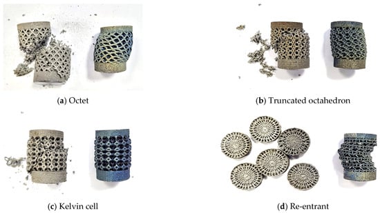 Furthermore, in the review by Shivank et al. [41], the maximum compressive strength of many lattice types of additive-manufactured specimens from Ti-6Al-4V was in the range of 125–228 MPa, while the elastic modulus was in the range of 0.2–35 GPa. In our case, the average maximum compressive strength for the Ti-6Al-4V lattice was in the range of 30.39–290.17 MPa (the lowest was for the re-entrant lattice and the highest was for the octet lattice), and between 1.74 and 4.72 GPa for the elastic modulus. Riva et al. [42] also collected data from compression tests of Ti-6Al-4V lattice structures with many cell types, orientations, and strut sizes. They observed that the maximum compressive strength can reach up to 345 MPa (a value higher than those recorded in this study but on different lattices). Choy et al. [26] studied the compressive properties of functionally graded strut lattice structures with cubic and honeycomb cells manufactured by SLM from Ti-6Al-4V alloy. They obtained the first maximum compressive strength in the range of 64–692 MPa. The same authors reported in another study [43], based on strut lattice structures with cubic and honeycomb cells with different orientations and densities, a first maximum compressive strength in the range of 14–244 MPa. Significant differences were also recorded in the present study among the different cell types, demonstrating that multiple studies should be performed to select an optimum cell type and its dimensions for a specific application.