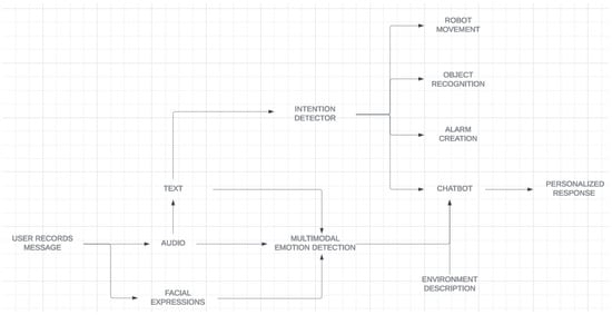 The overall system architecture is meticulously designed to enable seamless interaction between the user and Pepper. The interaction process is initiated when the user records a voice message through a mobile application. When the user presses the recording button on the mobile interface, a signal is sent to activate Pepper’s camera. The camera begins capturing frames of the user’s facial expressions with a slight temporal delay, which are then passed through a CNN to analyze the predominant facial emotion over the recording duration. Simultaneously, the system records the audio message. Once the recording is complete, the audio is processed by a separate CNN to extract auditory emotions, while the text transcription of the audio is analyzed for textual emotion detection. These modalities are integrated to determine the overall emotional state of the user during the interaction. Once the recording is complete, the system processes the audio data, transcribed text, and visual inputs to ascertain the predominant emotion expressed by the user. The transcribed text undergoes intent analysis to determine the user’s request, which then directs Pepper to perform corresponding actions such as setting reminders, controlling movement, initiating chatbot conversations, or activating object recognition functionalities.