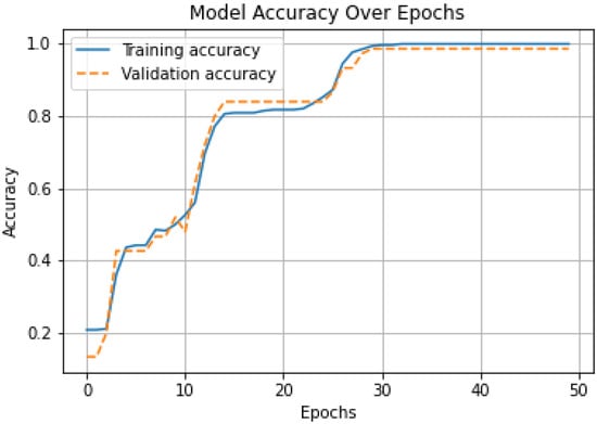 The performance analysis of the accuracy and loss graphs demonstrates the model’s effectiveness during training and validation phases. The accuracy curve shows a steady improvement, reaching values close to 100%, indicating the model’s proficiency in learning to classify intentions correctly. The loss curve, on the other hand, steadily decreases, reflecting the model’s improved capability to minimize errors.