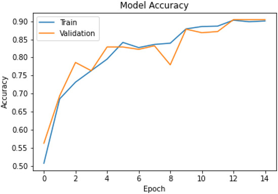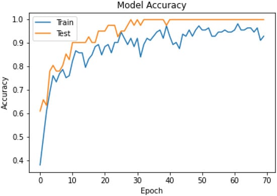 This subsection focuses on the training results of the RNN model used for intention recognition. The goal is to evaluate the model’s effectiveness in correctly identifying user intentions, which is essential for seamless and efficient human–robot interaction. The accuracy/epochs curve is shown in