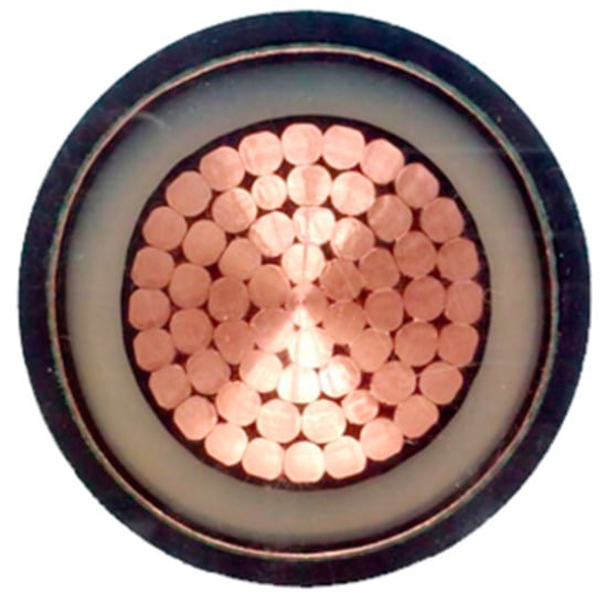 Cross-linked polyethylene (XLPE) insulated cables are widely used in medium-, high-, and ultra-high-voltage land-based and submarine direct current (DC) cables due to their excellent insulation strength, mechanical properties, and thermal performance [,]. A typical cross-section of an XLPE cable is shown in Figure 1, where the white part is the XLPE insulation.