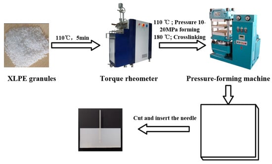 In this study, ultra-clean XLPE cable material LS4258DCE (Borealis, Vienna, Austria) was employed for the preparation of the samples. Initially, the raw granular material was placed in a torque rheometer and mixed for 5 min at 110 °C to ensure uniform blending. The mixture was then promptly removed and cut into small pieces. These pieces were placed into a mold which is 5 mm thick, and a pressure-forming machine was used to shape them. The process began at 105 °C, with pressure applied every 4 min, gradually increasing to 10 MPa after about 5 pressurizations. Subsequently, the pressure was raised further to 20 MPa at 3 min intervals over 4 pressurizations. The temperature was then increased to 180 °C and held for 15 min to ensure the cross-linking of the material. Upon completion, the sample was cooled to room temperature and then removed to obtain a preform of dimensions 120 mm × 120 mm × 5 mm. The temperature and pressure parameters mentioned above are referenced from related electrical studies [,,] on XLPE samples. The specific manufacturing process is shown in Figure 3.