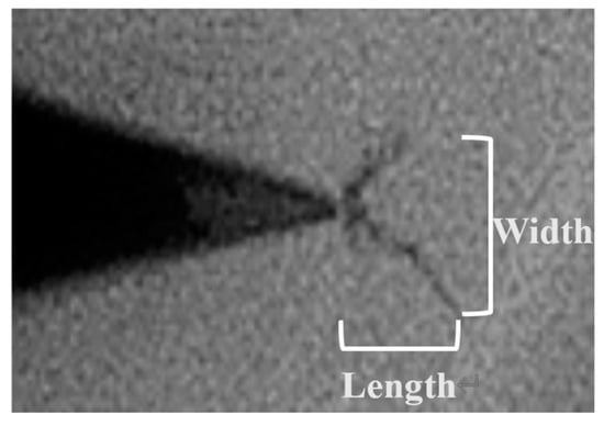 As the voltage required to initiate the electrical tree under DC voltage is excessively high, experiments often use AC voltage to induce the initial electrical tree, followed by the application of DC voltage. This experimental method was also adopted in this study. The characteristics of the initial electrical tree induced are presented below. To facilitate the description of the electrical tree’s dimensions, its length and width are defined, as shown in Figure 5.