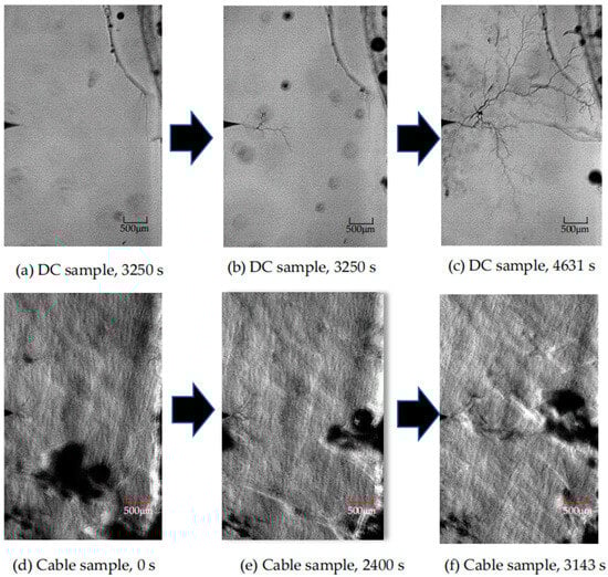 The DC electrical treeing patterns in both the DC sample and the Cable sample at different time intervals as they grow towards breakdown are shown in Figure 7. From Figure 7a,d, it can be observed that when the voltage first reaches 25 kV, the electrical treeing in both materials is in its initial state, characterized by a small size and a dendritic structure. As shown in Figure 7b,e, with the increase in voltage application time, the length and width of the electrical trees gradually expand. Multiple branches emerge at the needle tip in both samples, with one primary branch growing longer than the other. As the applied voltage continues to be maintained, and the electrical treeing approaches breakdown; the electrical tree patterns inside the samples are depicted in Figure 7c,f. In this stage, the treeing extends toward the grounded electrode. Notably, in the Cable sample, the treeing primarily exhibits growth in the length direction, whereas in the DC sample, significant growth is also observed in the width direction. The width of the electrical tree in the DC sample is noticeably larger than that in the Cable sample.