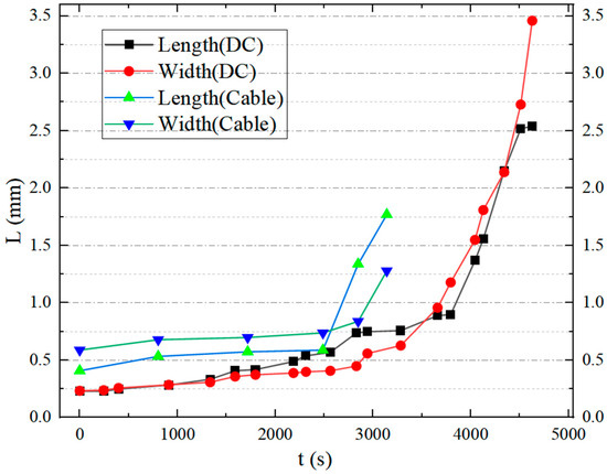 The variations in the length and width of electrical trees during the growth process in different XLPE samples are shown in Figure 8. It can be observed that, in the initial stage of constant voltage, the length and width of the electrical tree in the DC sample slowly increase from 0.25 mm to 0.75 mm within 3500 s. Subsequently, the size of the electrical tree rapidly expands. From 3500 to 4631 s, the length of the tree quickly grows from 0.75 mm to 2.5 mm, with even faster growth in the width direction, reaching 3.5 mm, followed by breakdown. In contrast, the Cable sample shows almost no growth in the early stage of constant voltage. However, starting from 2500 s, its electrical tree rapidly grows in both length and width, eventually leading to breakdown at 3143 s. It is noteworthy that the absence of data for the Cable sample’s length growth from 1.75 mm to the 3 mm gap between the needle and plate is due to its direct breakdown following multiple discharges at 1.75 mm.