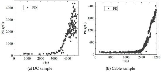 Figure 9b reflects the size of the electrical tree and the partial discharge signals at different times for the Cable sample. Similarly, no partial discharge signals were detected in the early constant voltage phase. PD signals began to appear at 200 s. In the first 2400 s, the maximum discharge magnitude gradually increased to 300 pC. From 2400 s to the breakdown, both the size of the electrical tree and the PD amplitude continued to increase, with a relatively small dispersion in the growth of PD amplitude.