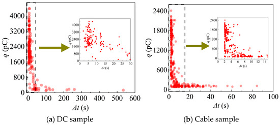 Further analysis of the PD characteristics during the growth process of DC electrical trees in different XLPE samples was conducted by statistically analyzing the PD amplitude after each discharge interval, resulting in the q-Δt plots, as shown in Figure 10. By observing the maximum discharge amount corresponding to each discharge interval, both Figure 10a,b indicate a trend where the maximum discharge amount first increases and then decreases as the discharge interval increases. When the discharge interval extends to tens or even hundreds of seconds, the corresponding discharge amount tends to be relatively small. Based on the experimental results, it is evident that these small discharges with long intervals typically occur when the electrical tree is relatively small. As the electrical tree grows, both the discharge amount and the average discharge interval decrease significantly. According to the typical DC discharge interval model [], for the same defect, the longer the discharge interval, the larger the resulting discharge amount should be. Considering the characteristics of electrical trees, the following hypothesis is proposed: when the electrical tree is small, the insulation properties of the sample are relatively strong, leading to a longer electric field recovery time after each PD event, which results in a longer discharge interval and smaller discharge amount. As the electrical tree grows, the discharge amount increases, while the electric field recovery rate after each PD event accelerates, reducing the discharge interval. Therefore, when Δt is small, the discharge amount is positively correlated with Δt, as the charge accumulated from the previous discharge gradually dissipates and the electric field within the tree channel continues to increase. However, when Δt further increases without significant changes in the electric field within the channel, the discharge amount depends only on the size of the electrical tree. Consequently, as the discharge interval increases, the maximum discharge amount first rises and then falls.