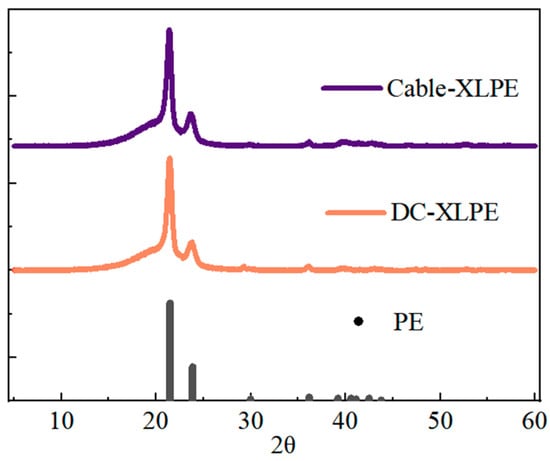 The XRD results are shown in Figure 11, where the horizontal axis represents the diffraction angle. The vertical lines indicate the typical crystalline peaks of polyethylene (PE), revealing that the diffraction peaks of both types of cross-linked polyethylene (XLPE) correspond closely to those of PE. As observed in the figure, both XLPE samples exhibit a strong diffraction peak at a diffraction angle 2θ = 21.5°, corresponding to the (110) crystal plane of PE. A second diffraction peak appears at 2θ = 23.8°, corresponding to the (200) crystal plane of the crystal. The diffraction curve results indicate no significant differences in the aggregated structure of the two materials.
