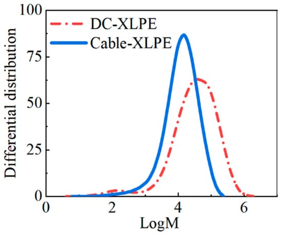 In this study, the GPC tests were conducted using a high-temperature gel permeation chromatograph, specifically the EcoSEC HLC-8321GPC/HT (Showa Denko K.K., Tokyo, Japan), with o-dichlorobenzene as the solvent. The GPC results for the two XLPE samples are shown in Figure 12, where the horizontal axis represents the logarithm of the relative molecular weight. From the molecular weight distribution curves, it can be observed that both XLPE samples exhibit a primary peak corresponding to high molecular weight components. However, the DC sample also shows a minor peak corresponding to low molecular weight components. Additionally, the primary high molecular weight peak of the DC sample is shifted further to the right compared to that of the Cable-XLPE, indicating a larger relative molecular weight in the high molecular weight fraction in the DC sample.