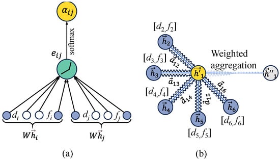 The attention weights between different nodes are obtained through a multi-head attention mechanism, as shown in Figure 1b. In addition, these attention weights, αij allow the weighted aggregation of neighbor features hj to update the feature vector of each node hj’, culminating in the refined representation of each node hi’’ within the network.