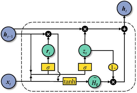 where σ denotes the sigmoid function which limits outputs to a range between 0 and 1; tanh represents the hyperbolic tangent function that scales outputs between −1 and 1; xt represents the current input; ht denotes the hidden state; is the Hadamard product; weight matrices Wz, Wr, and W correspond to the update gate, reset gate, and candidate hidden state; while bz, br, and b denote the bias terms for these gates. The candidate hidden state vector is represented by . The operation “1–” signifies the subtraction of the update gate’s output from 1, which calculates how much old information is kept in the new hidden state.