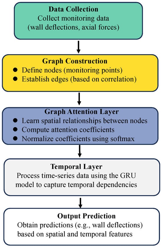 To overcome this lag, a possible solution is to use predictions from predictive methods to replace current monitoring data. Predictive methods, such as analytical solutions, numerical models, and data-driven models, are widely applied. In geotechnical engineering, data-driven models have proven more accurate than other methods due to their ability to utilize real data [,,,,,]. For soil deformation, Yang et al. [] developed a maximum deformation prediction model for braced excavations based on gated recurrent unit (GRU) algorithms and field observation data. The reliability of the model is verified through two engineering cases. Mahmoodzadeh et al. [] employed seven intelligent methods, including long short-term memory (LSTM) networks and deep neural networks (DNNs), to predict the maximum surface settlement in urban tunneling. The results showed that the DNN method performed the best. Recently, several studies have considered the spatiotemporal relationships in braced excavation deformations [,,,,,,]. Tao et al. [] developed a deep learning model based on convolutional neural networks (CNNs) to consider spatial relationships between multiple monitoring points, improving the prediction of braced excavation deformations. Furthermore, Tao et al. [] proposed a deep transfer learning method to achieve early-stage deformation predictions during excavations. However, these studies mainly rely on CNNs to extract spatial features, assigning equal weight to each node. Consequently, these approaches cannot differentiate the importance of monitoring points.