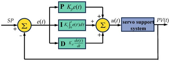 The PID controller is a widely used feedback mechanism in engineering fields such as industrial automation, robotics, and aerospace due to its rapid response and precise system control []. Current servo support systems for braced excavation mainly control deformation by setting and maintaining support axial forces within a predefined range. By introducing a PID controller, the system uses target deformation values as setpoints, continuously monitors deformation, and automatically adjusts the axial forces based on deviations to control the deformation closer to the target. This method controls deformation more directly, enhancing control precision and response speed. Therefore, the PID controller is considered as the control method for wall deflection in this study. Figure 4 shows the process to control wall deformations using a PID controller. First, the difference between the target deformation (setpoint, SP) and the actual monitored wall deformation (process variable, PV(t)) is defined as the error e(t):