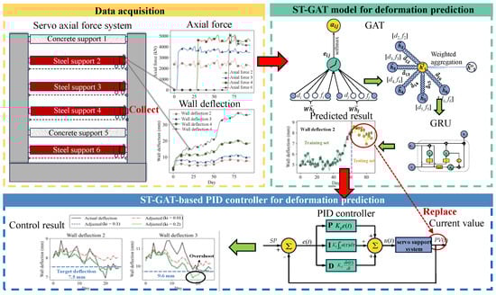 The following flowchart presents the proposed method for predicting and controlling wall deflections (Figure 5). First, a servo axial force system is introduced as it allows for the adjustment of steel support axial forces according to project requirements, thereby actively controlling the excavation-induced deformations. This servo system is a prerequisite for the implementation of the proposed method. Following this, the dataset is collected, including the axial forces of four servo steel supports from one inclinometer along with the wall deflection data from nearby monitoring points. These data are preprocessed through min–max normalization to standardize the scale, preventing certain features with larger or smaller values from dominating the model training. The correlation between the axial forces and deflection at the same monitoring point is analyzed to explore the effect of axial forces on wall deflections, while the correlation between different monitoring points is examined to understand the spatial relationships among them. A graph attention structure is then constructed, assigning varying weights to each monitoring point based on its spatial significance. These spatially informed outputs are subsequently fed into a temporal GRU network to establish the ST-GAT model. Based on the hyperparameter-optimized ST-GAT model, a wall deflection proactively control method is proposed. Specifically, the ST-GAT model generates predicted wall deflections, which are then used to replace the real-time deflection measurements in the PID controller. This enables the controller to use predicted values for more accurate and timely adjustments of the servo axial forces rather than relying solely on current deflection records.