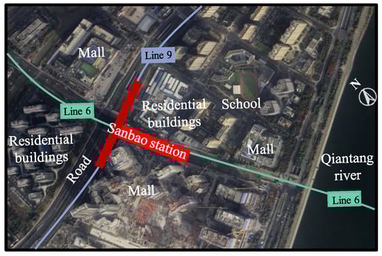 The proposed ST-GAT-based model is evaluated through the Sanbao Station excavation project, which is a subway station located in Hangzhou, China. Figure 6 shows the specific location of the project. Sanbao Station is a high-risk deep excavation project, which is classified as a Grade 1 excavation based on the Chinese national code []. The excavation depth ranges from 23.85 to 25.41 m with complex surrounding conditions, including underground pipelines and challenging geological features. The area is densely populated with residential buildings, schools, and intricate road networks, making deformation control essential due to the proximity to sensitive infrastructure such as schools and subway tunnels. The main structure of the station is 175 m long. The standard section is 22.79 m wide, while the width at the end shaft is 27 m. The top slab is covered by approximately 3.05 m of soil, and the base of the foundation at the station center is buried at a depth of 30.85 m. At the end shaft, the foundation reaches a depth of 32.41 m. The main enclosure structure of Sanbao Station consists of 1200 mm thick diaphragm walls, which is supported by four levels of concrete struts and five levels of steel struts.