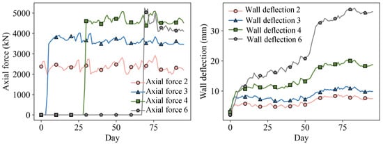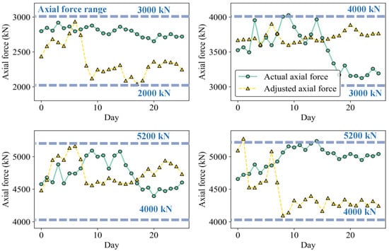 When evaluating the proposed wall deflection control system, it is necessary to consider whether the axial forces are reasonable. Excessively high or low axial forces in the steel supports can affect the stability of the support system. High axial forces may cause the supports to fail or excessively deform, while low forces may provide insufficient support, both of which can lead to structural failure. Figure 19 shows the comparison of axial forces before and after adjustment. The reasonable range is determined by the historical maximum and minimum values of these steel supports. The axial force ranges for the steel supports are as follows: 2000 kN to 3000 kN for support 2, 3000 kN to 4000 kN for support 3, and 4000 kN to 5200 kN for supports 4 and 6. The results show that the adjusted axial forces for all four steel supports fall within the reasonable range, demonstrating the effectiveness of the proposed model. In addition, the proactive control system contributes significantly to the safety and cost-effectiveness of excavation projects. By enabling predicted monitoring and the adjustment of axial forces, the system facilitates the prevention of support failure or structural instability, reducing the risk of accidents and associated costs. Moreover, precise control minimizes the likelihood of over-reinforcement, optimizing material usage and lowering overall project expenses. When the strict control of axial forces is required, the system can also be pre-set with axial force ranges based on design guidelines and engineering experience, further enhancing its practical utility.